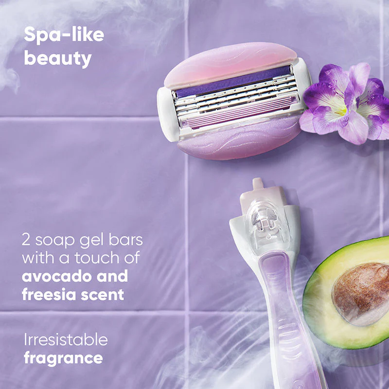 مناسب بانوان دارای 3 تیغ سر متحرک به همراه 2 عدد یدک دارای نوار ژلی-صابونی حاوی عصاره گل فریزیا مانع از خراش و التهابات پوستی دارای دسته ارگونومیک