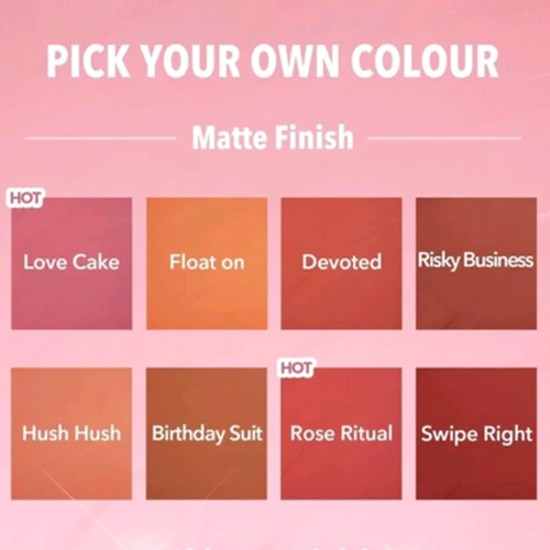 | رنگ | Birthday suit, Cutie pie, Devoted, float on, Hot topic, Hush Hush, Love Cake, On point, petal talk, Real deal, Risky Business, Rose Ritual, swipe right |