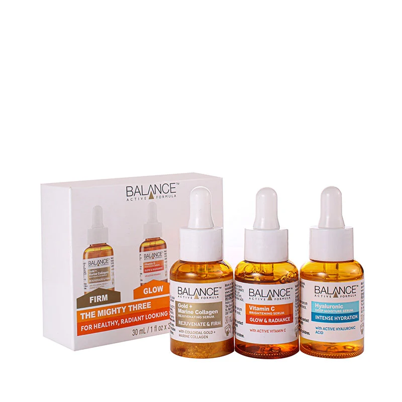 این مجموعه سهتایی از سرمهای برند BALANCE با نام “The Mighty Three” طراحی شده تا یک راهحل جامع برای مراقبت روزانه از پوست ارائه دهد. این مجموعه شامل سه سرم با عملکردهای مختلف است که در کنار یکدیگر، پوستی سالم، شفاف و آبرسانی شده را به ارمغان میآورند. هر سرم دارای ترکیبات فعال و کاربرد ویژهای است که به نیازهای خاص پوست پاسخ میدهد.