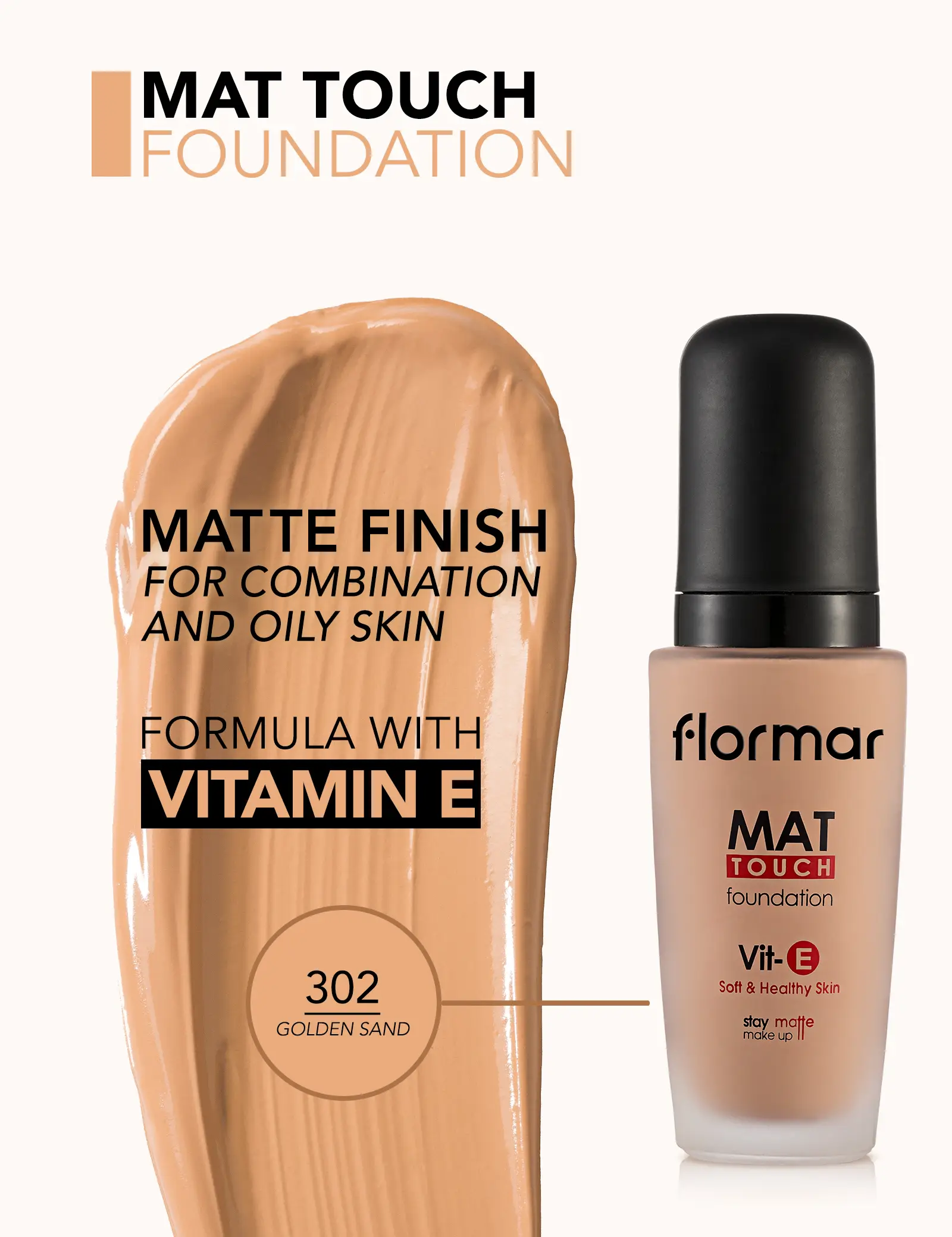 ‘- جلوه مات و طبیعی – پوششدهی متوسط تا بالا – حاوی ویتامین E – کنترل چربی پوست – مناسب برای پوست چرب و مختلط – بدون ایجاد سنگینی یا ماسیدگی