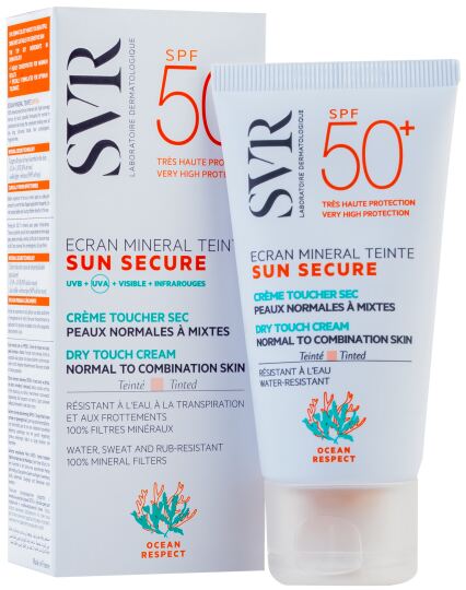 کرم ضد آفتاب مینرال رنگی +SPF50 پوست نرمال تا مختلط اس وی آر حاوی ۱۰۰% فیلترهای ضدآفتاب مینرال نانو و فرم پایدار ویتامین E و یک آنتی اکسیدان بسیار قوی است که از پوست در برابر اشعههای UVA و UVB محافظت و از پیری و چروک ناشی از نور آفتاب جلوگیری میکند. ضد آفتاب رنگی مینرال سان سکیور اس وی آر مناسب پوست های نرمال تا مختلط بوده و حاوی مواد معدنی و رنگ گیاهی جهت یکنواخت کردن پوست است.